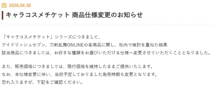 バンダイが運営する化粧品ブランド「クレアボーテ」は4月30日、キャラクターコスメチケットシリーズから「アイドリッシュセブン」と「刀剣乱舞ONLINE」のランダム販売を中止すると発表した。同社公式Xを通じて「商品仕様変更のお知らせ」を公開し、「『キャラコスメチケット』シリーズにつきまして、アイドリッシュセブン、刀剣乱舞ONLINEの各商品に関し、社内で検討を重ねた結果、該当商品につきましてはお好きな種類をお選びいただける仕様へ変更させていただくこととなりました」と説明した。